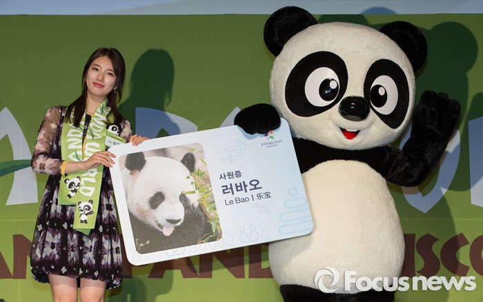 (용인=포커스뉴스) 21일 오전 경기도 용인시 에버랜드에서 열린 '판다월드 개관식'에서 미쓰에이 수지가 러바오 팬더 캐릭터 인형과 기념촬영을 하고 있다.