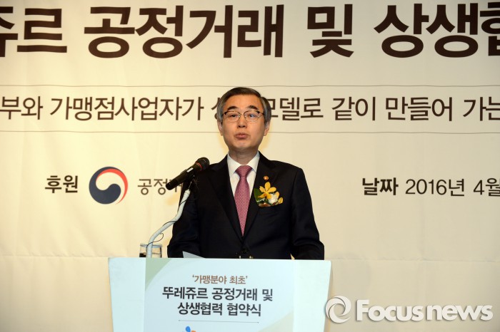 정재찬 공정거래위원장은 “영업지역 설정 등 구체적인 협약 내용을 둘러싸고 가맹점주와 본부 간 힘겨루기도 있었지만, 진지한 대화와 협상을 통해 합리적인 결론을 냈다고 들었다. 오늘 협약이 가맹사업의 공정거래와 상생협력 문화 확산에 시금석이 될 수 있기를 기대한다”고 말했다.<사진출처=공정거래위원회> 2016.04.21 이규하 기자