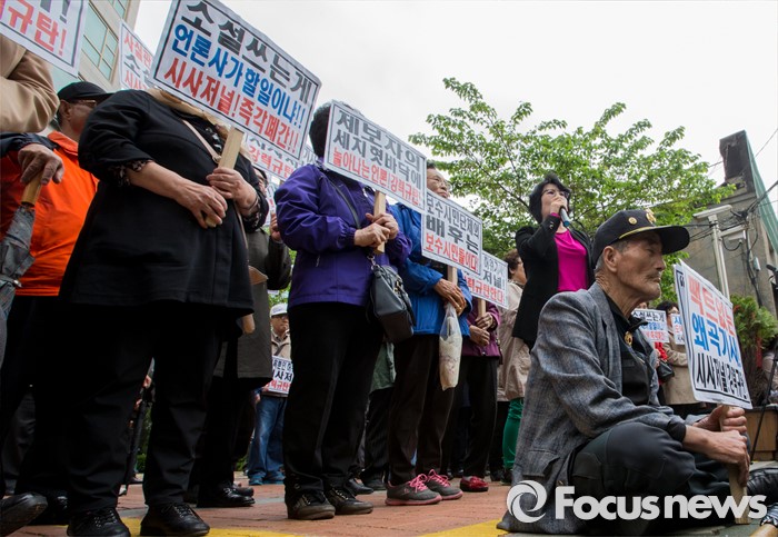 (서울=포커스뉴스) 최근 전경련의 차명계좌 자금 지원 의혹을 받고 있는 어버이연합 회원들이 21일 오후 서울 용산구 시사저널 사옥 앞에서 시사저널 규탄 기자회견을 하고 있다.