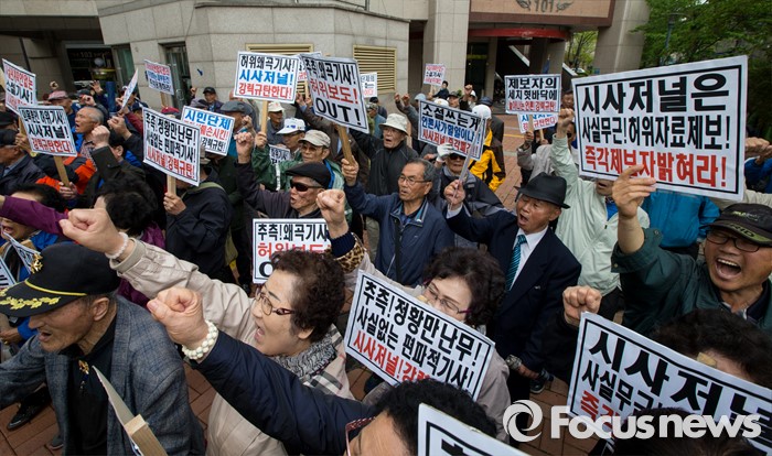 (서울=포커스뉴스) 최근 전경련의 차명계좌 자금 지원 의혹을 받고 있는 어버이연합 회원들이 21일 오후 서울 용산구 시사저널 사옥 앞에서 시사저널 규탄 기자회견을 하고 있다.