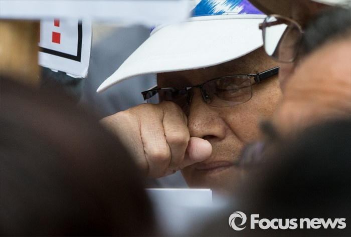 (서울=포커스뉴스) 최근 전경련의 차명계좌 자금 지원 의혹을 받고 있는 어버이연합 회원들이 21일 오후 서울 용산구 시사저널 사옥 앞에서 시사저널 규탄 기자회견을 가졌다. 이날 회견에 참석한 한 회원이 눈물을 훔치고 있다.