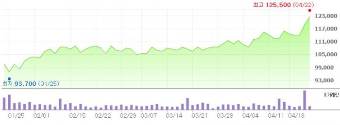 이에 따라 KT&G에 대한 목표주가를 종전 12만6000원에서 14만4000원으로 상향 조정했다.최근 3개월간 KT&G 주가 추이 <그래픽출처=네이버>