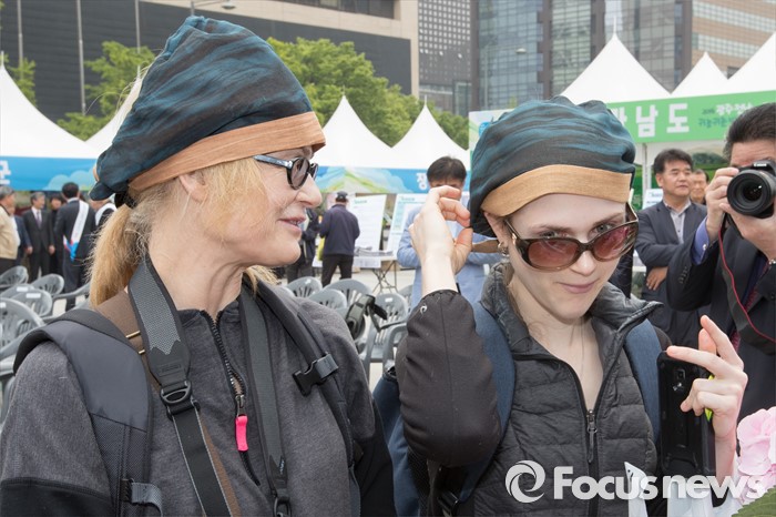 (서울=포커스뉴스) 22일 오전 서울 광화문 광장에서 열린 '2016 광주·전남 귀농귀촌 박람회' 강진군 부스에서 외국인 관광객들이 천연염색두건을 착용해 보고 있다.