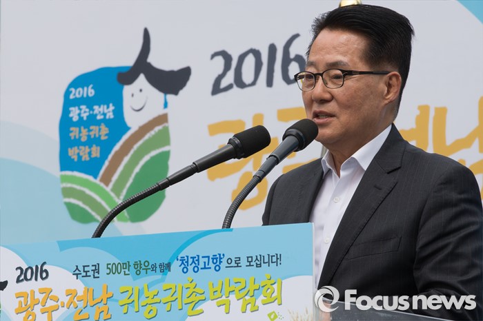 (서울=포커스뉴스) 22일 오전 서울 광화문 광장에서 열린 '2016 광주·전남 귀농귀촌 박람회'에서 박지원 국민의당 의원이 축사를 하고 있다.