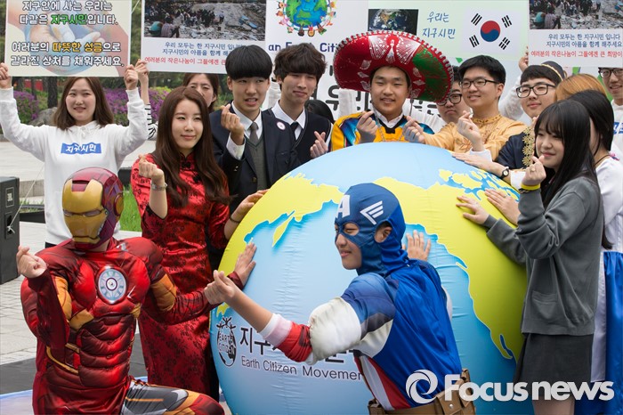 (서울=포커스뉴스) 22일 서울 종로구 광화문시민열린마당에서 지구시민운동연합 회원들이 제46회 지구의 날을 기념해 '나는 지구시민입니다'라는 주제로 플래시몹을 하고 있다.