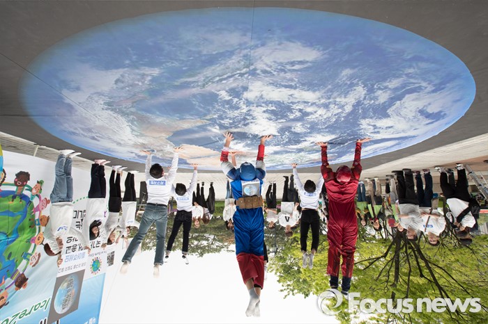 사진은 180도 뒤집어서 회원들이 마치 지구를 든 것처럼 보이는 모습.
