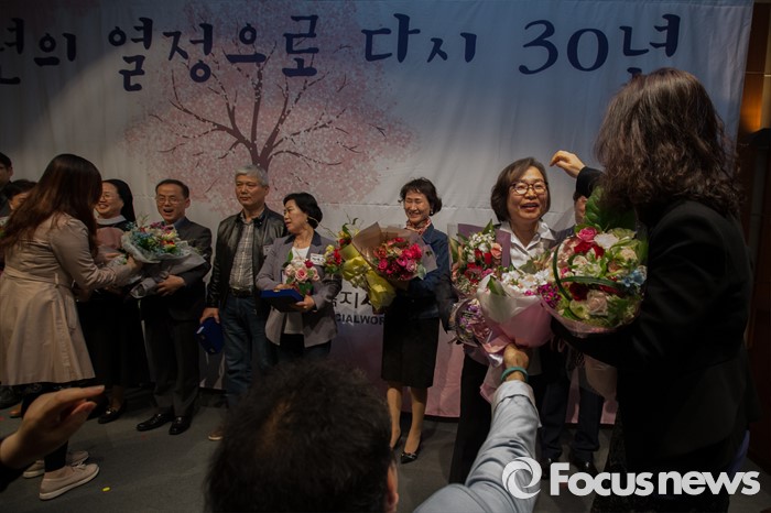 (서울=포커스뉴스) 22일 오후 서울 용산구 백범기념관에서 열린 사회복지사협의회 창립 30주년 기념행사에서 공로패 수여받은 사회복지사들이 축하를 받고 있다.