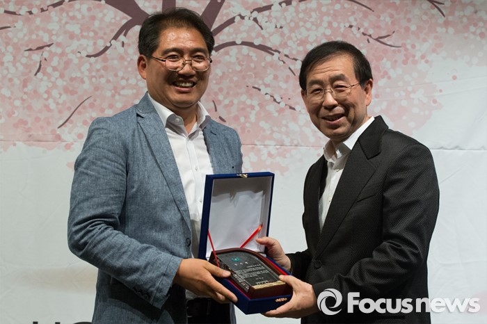 (서울=포커스뉴스) 22일 오후 서울 용산구 백범기념관에서 열린 사회복지사협의회 창립 30주년 기념행사에서 장재구(왼쪽) 사회복지사협회 회장이 박원순 서울시장에게 공로패를 전달하고 있다.