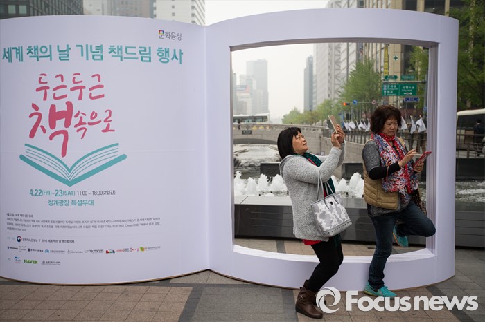 (서울=포커스뉴스) 세계 책의 날을 하루 앞둔 22일 오후 서울 중구 태평로 청계광장에서 열린 2016 세계 책의 날 기념 '두근두근 책 속으로' 책드림 날 행사에서 외국인 관광객들이 기념사진을 찍고 있다.