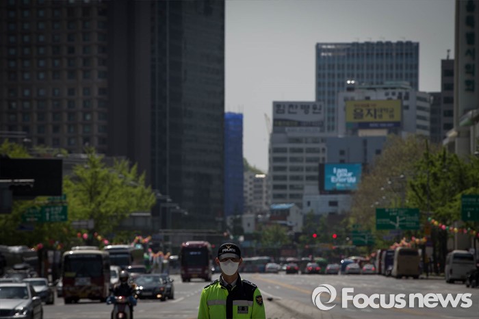 (서울=포커스뉴스) 서울지역에 33시간 지속됐던 미세먼지주의보가 해제된 24일 오전 서울 광화문 일대에 경찰들이 마스크를 쓰고 근무하고 있다.