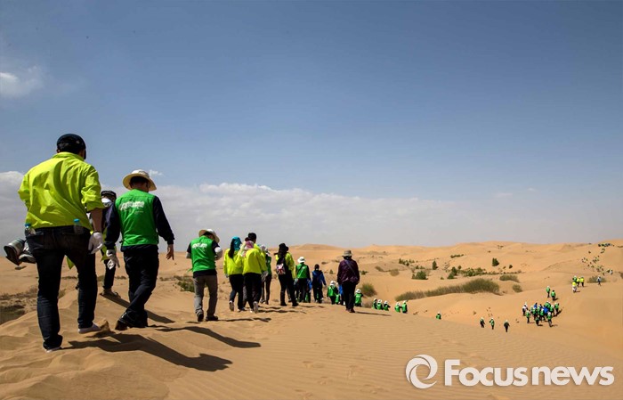 (다라더치/중국=포커스뉴스) 24일 오전 중국 내몽고 다라더치 쿠부치사막에서 한ㆍ중ㆍ일 대학생들로 구성된 2016 미래숲 15기 녹색봉사단원들이 사막트래킹을 하고 있다. 미래숲 녹색봉사단은 이번 봉사활동을 통해 황폐화된 사막에 나무 심기 및 각국 청년들과 우호를 증진을 위한 교류 활동을 전개할 예정이다.