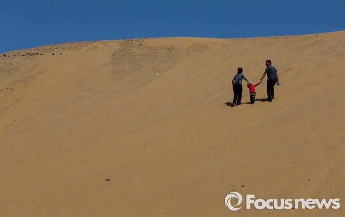 (다라더치/중국=포커스뉴스) 24일 오전 중국 내몽고 다라더치 쿠부치사막에서 한ㆍ중ㆍ일 대학생들로 구성된 2016 미래숲 15기 녹색봉사단원들이 사막트래킹을 하고 있는 가운데, 한 중국인 가족이 함께 사막을 걷고 있다. 미래숲 녹색봉사단은 이번 봉사활동을 통해 황폐화된 사막에 나무 심기 및 각국 청년들과 우호를 증진을 위한 교류 활동을 전개할 예정이다.