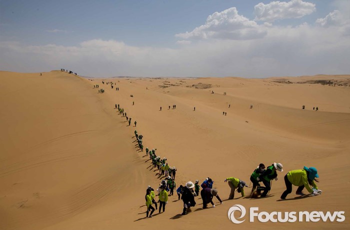 (다라더치/중국=포커스뉴스) 24일 오전 중국 내몽고 다라더치 쿠부치사막에서 한ㆍ중ㆍ일 대학생들로 구성된 2016 미래숲 15기 녹색봉사단원들이 사막트래킹을 하고 있다. 미래숲 녹색봉사단은 이번 봉사활동을 통해 황폐화된 사막에 나무 심기 및 각국 청년들과 우호를 증진을 위한 교류 활동을 전개할 예정이다.