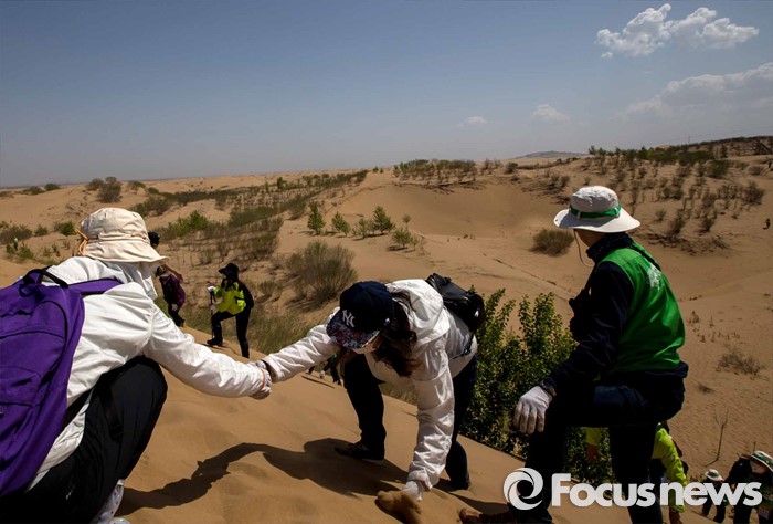 (다라더치/중국=포커스뉴스) 24일 오전 중국 내몽고 다라더치 쿠부치사막에서 한ㆍ중ㆍ일 대학생들로 구성된 2016 미래숲 15기 녹색봉사단원들이 사막트래킹을 하고 있다. 미래숲 녹색봉사단은 이번 봉사활동을 통해 황폐화된 사막에 나무 심기 및 각국 청년들과 우호를 증진을 위한 교류 활동을 전개할 예정이다.
