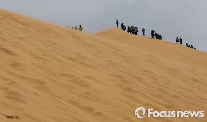 (다라더치/중국=포커스뉴스) 24일 오전 중국 내몽고 다라더치 쿠부치사막에서 한ㆍ중ㆍ일 대학생들로 구성된 2016 미래숲 15기 녹색봉사단원들이 사막트래킹을 하고 있다. 미래숲 녹색봉사단은 이번 봉사활동을 통해 황폐화된 사막에 나무 심기 및 각국 청년들과 우호를 증진을 위한 교류 활동을 전개할 예정이다.
