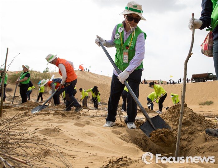 (다라더치/중국=포커스뉴스) 24일 오후 중국 내몽고 다라더치 쿠부치사막에서 2016 미래숲 15기 녹색봉사단 후원사 회원들이 나무심기작업을 하고 있다. 미래숲 녹색봉사단은 이번 봉사활동을 통해 황폐화된 사막에 나무 심기 및 각국 청년들과 우호를 증진을 위한 교류 활동을 전개할 예정이다.