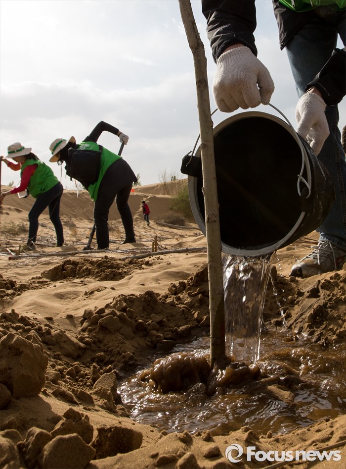 (다라더치/중국=포커스뉴스) 24일 오후 중국 내몽고 다라더치 쿠부치사막에서 2016 미래숲 15기 녹색봉사단 후원사 회원들이 나무심기작업을 하고 있다. 미래숲 녹색봉사단은 이번 봉사활동을 통해 황폐화된 사막에 나무 심기 및 각국 청년들과 우호를 증진을 위한 교류 활동을 전개할 예정이다.