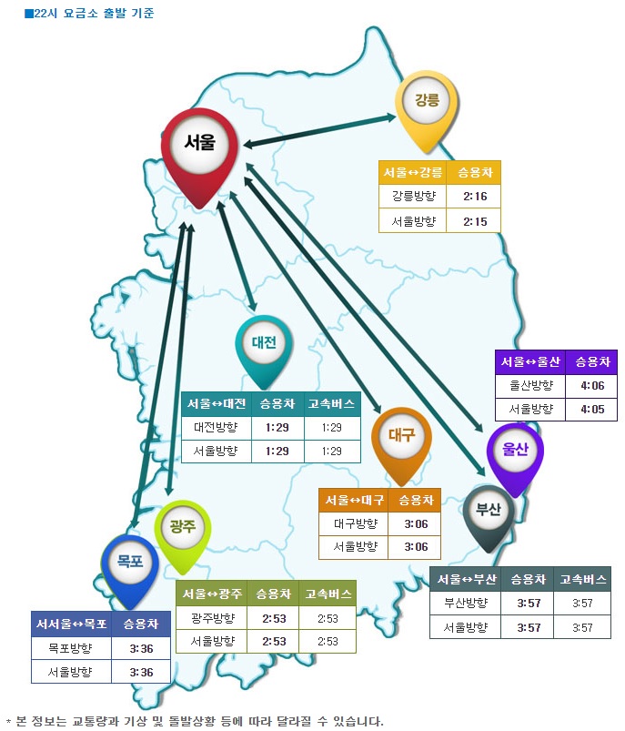 오후 10시 기준 주요 도시에서 서울까지 소요되는 시간은 강릉 2시간 15분, 부산 3시간 57분, 대구 3시간 6분, 광주 2시간 53분, 목포 3시간 36분, 대전 1시간 29분 등이다.