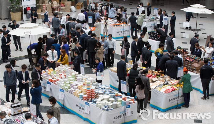 (대전=포커스뉴스) 28일 오전 정부대전청사 중앙홀에 마련된 개성공단 우수상품 특별판매전에서 공무원들이 제품을 살피고 있다. 개성공단 우수상품 특별판매전은 개성공단 입주기업 피해를 최소화 하기 위해 중소기업청이 주최했다.