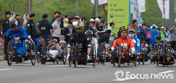 (서울=포커스뉴스) 30일 오전 서울 송파구 잠실종합운동장 인근에서 열린 '제24회 서울국제휠체어마라톤대회'에서 참가자들이 힘차게 출발하고 있다.