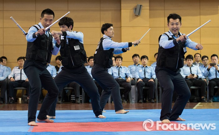 (서울=포커스뉴스) 28일 오후 서울 성동구 서울메트로 인재개발원에서 열린 지하철보안관 무술 경연 대회에서 서울메트로 소속 지하철보안관들이 무술 시범을 선보이고 있다.