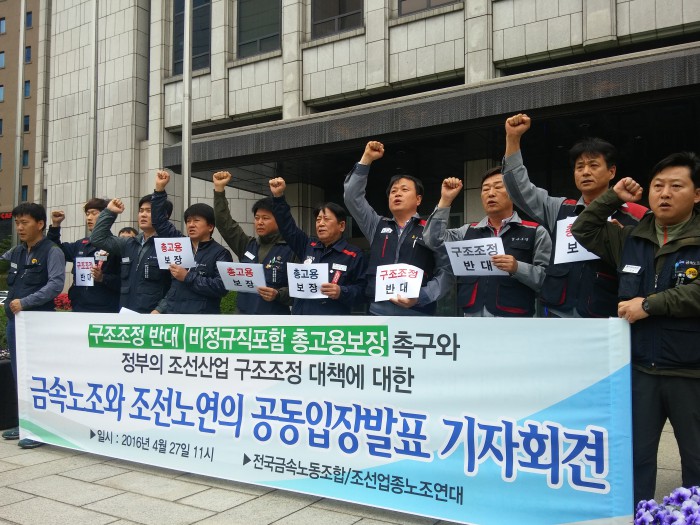 금속노조와 조선노동조합연대(이하 조선노연)는 27일 오전 서울 중구 금융위원회 앞에서 기자회견을 열고 인력감축과 임금체계 개편에 앞서 조선업종에 대한 정부의 책임 있는 회생 대책을 요구했다.