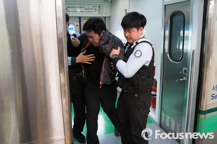 (서울=포커스뉴스) 28일 오후 서울 성동구 신설동행 열차 내에서 서울메트로 소속 지하철보안관들이 술에 취한 난동자를 제압하는 훈련을 하고 있다.