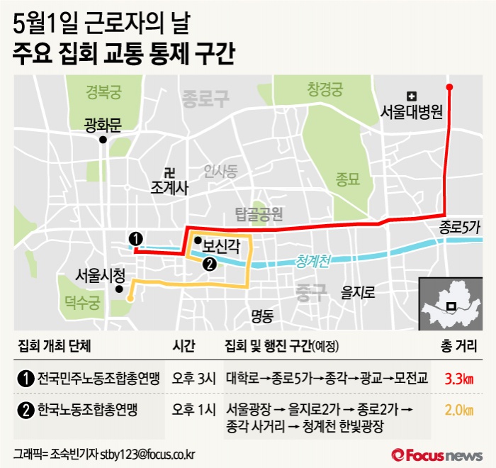 (서울=포커스뉴스) 근로자의 날인 5월 1일 양대노총 등 노동계가 도심 곳곳에서 대규모 집회와 행진을 개최할 것으로 알려져 서울 시내 도로 일부가 통제될 예정이다.