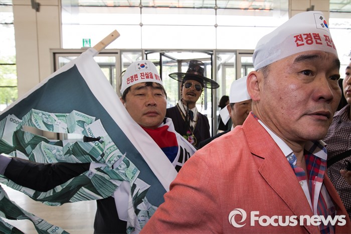 (서울=포커스뉴스) 26일 오후 서울 영등포구 전경련회관 앞에서 열린 어버이연합 억대 금품지원 규탄 기자회견이 끝나고 애국국민운동대연합 오천도 대표와 회원들이 상근부회장의 면담을 요청하고 있다.