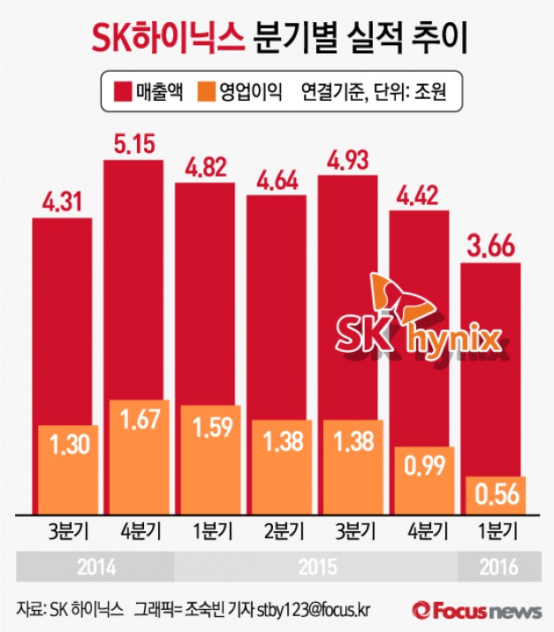(서울=포커스뉴스) SK하이닉스는 연결기준 2016년 1분기 매출액 3조6560억원, 영업이익 5620억원, 순이익 4480억원을 기록했다고 26일 밝혔다.