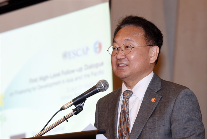 한국에서는 유 부총리, 최경수 한국거래소 이사장 등이, 우즈벡은 아지모프 제1부총리 겸 재무부장관, 가니예프 대외경제투자무역부장관 등이 참석했다.(인천=포서스뉴스) 유일호 부총리 겸 기획재정부장관이 3월30일 인천 송도 쉐라톤호텔에서 열린 '제1회 아태지역 개발재원 고위 후속대화'에 참석해 '지속가능개발목표(SDGs) 달성 및 개발재원 확대를 위한 한국의 아태지역 지원 방향'을 주제로 특별강연을 하고 있다. <사진제공=기획재정부>
