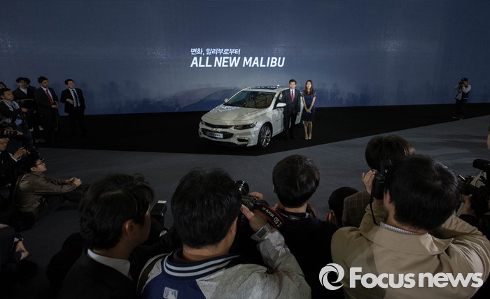 (서울=포커스뉴스) 27일 오전 서울 구로구 고척스카이돔에서 열린 한국지엠 '올 뉴 말리부' 신차 발표회에서 최희 아나운서와 제임스 김 한국지엠 사장이 신차 발표를 축하하며 취재진을 향해 포즈를 취하고 있다.
