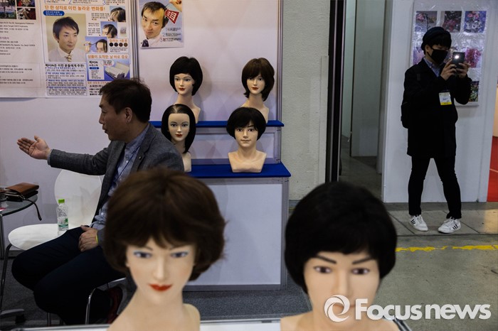 (서울=포커스뉴스) 28일 오전 서울 삼성동 코엑스에서 열린 2016 국제건강산업박람회에 참가한 한 업체 부스에 가발이 전시되어 있다 .