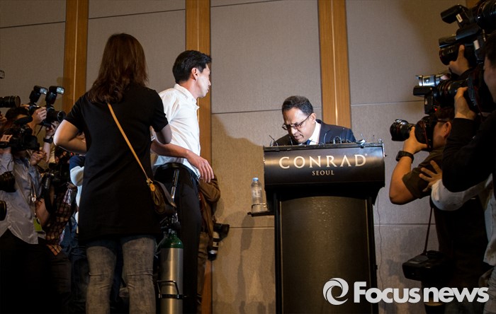 (서울=포커스뉴스) 2일 오전 서울 영등포구 콘래드호텔에서 열린 '옥시레킷벤키저(현 RB코리아) 가습기 살균제 파동' 관련 기자회견에서 아타 울라시드 사프달 옥시코리아 대표가 피해자 가족들에게 항의 받고 있다.