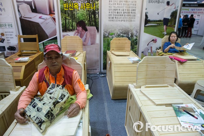 (서울=포커스뉴스) 28일 오전 서울 삼성동 코엑스에서 열린 2016 국제건강산업박람회에서 시민들이 반신욕 사우나기를 체험하고 있다 .
