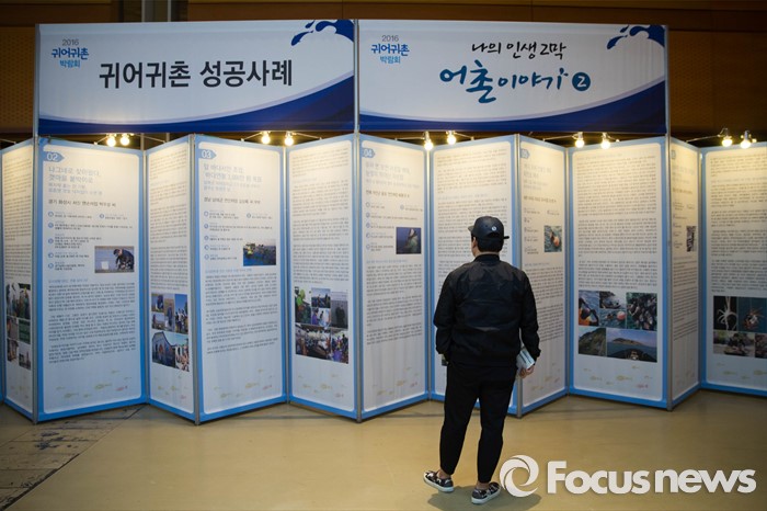 (서울=포커스뉴스) 28일 오전 서울 삼성동 코엑스에서 열린 2016 귀어귀촌 박람회장을 찾은 한 시민이 귀어귀촌 성공사례를 읽고 있다.