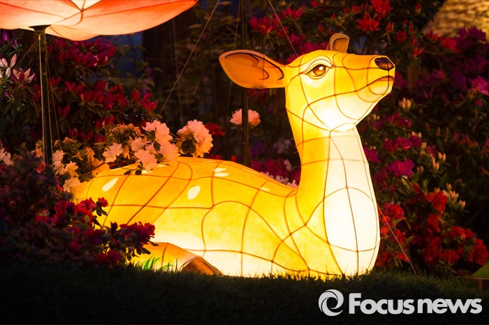 (서울=포커스뉴스) 부처님오신날을 앞두고 26일 밤 서울 종로구 견지동 조계사 정문 앞에 사슴 모양의 연등이 불을 밝히고 있다.