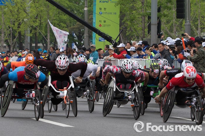 (서울=포커스뉴스) 30일 오전 서울 송파구 잠실종합운동장 인근에서 열린 '제24회 서울국제휠체어마라톤대회'에서 참가자들이 힘차게 출발하고 있다.