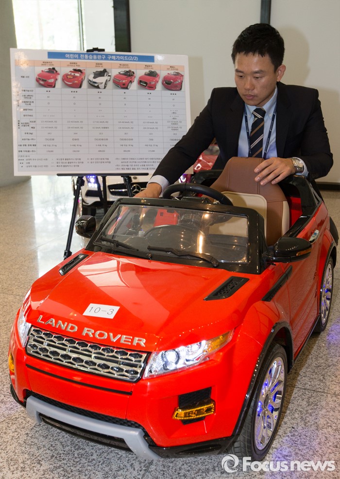 (세종=포커스뉴스) 2일 오전 세종시 정부세종청사 공정거래위원회에서 한국소비자원 관계자가 어린이 전동 승용완구 성능 및 안전성 등 제품별 차이를 설명하고 있다.