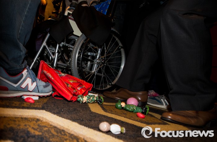 (서울=포커스뉴스) 2일 오전 서울 영등포구 콘래드호텔에서 열린 '옥시레킷벤키저(현 RB코리아) 가습기 살균제 파동' 관련 기자회견에 피해자 임성준 군의 휠체어와 장난감들이 놓여 있다.
