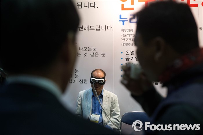 (서울=포커스뉴스) 28일 오전 서울 삼성동 코엑스에서 열린 2016 국제건강산업박람회에서 한 시민이 안구 마사지를 체험하고 있다.