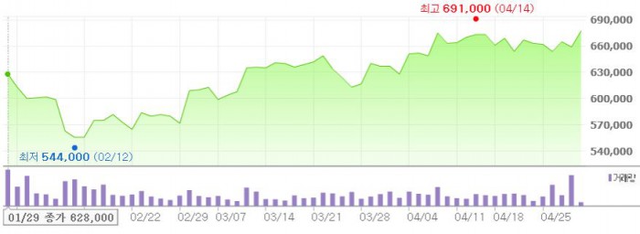 그는 "국내 광고는 검색광고 매출이 비수기임에도 불구하고 모바일광고 매출 확대로 전년 대비 21%, 전분기 대비 4% 증가했다"고 설명했다.최근 3개월간 네이버 주가 추이 <그래픽출처=네이버>