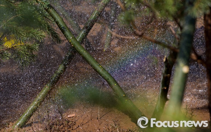 (다라더치/중국=포커스뉴스) 25일 오전 중국 내몽고 다라더치 쿠부치사막에서 2016 미래숲 15기 녹색봉사단원들이 심어놓은 소나무 사이로 무지개가 보이고 있다. 미래숲 녹색봉사단원은 이번 봉사활동을 통해 황폐화된 사막에 나무 심기 및 각국 청년들과 우호를 증진을 위한 교류 활동을 전개했다.
