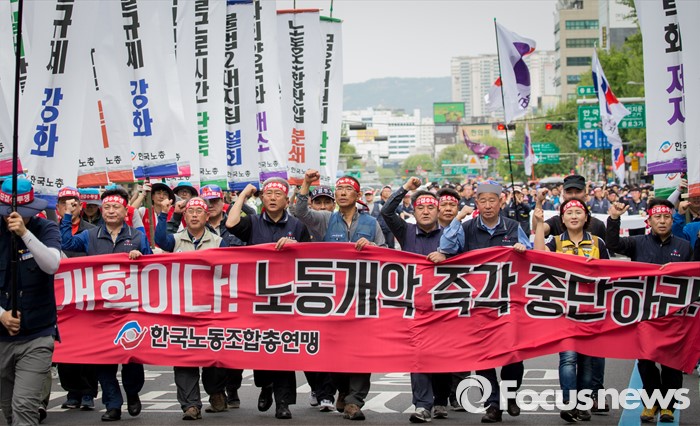(서울=포커스뉴스) 근로자의날을 맞은 1일 오후 서울광장에서 열린 한국노총 5.1 전국노동자대회를 마친 참가자들이 종로로 행진을 이어가고 있다.