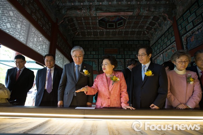 (서울=포커스뉴스) 27일 오후 서울 종로구 경복궁 집옥재에서 열린 궁궐 속 작은도서관 집옥재 개관행사를 마친 뒤 김종덕(왼쪽 세번째) 문화체육관광부 장관과 이배용 한국학중앙연구원 원장이 내부를 둘러보고 있다.