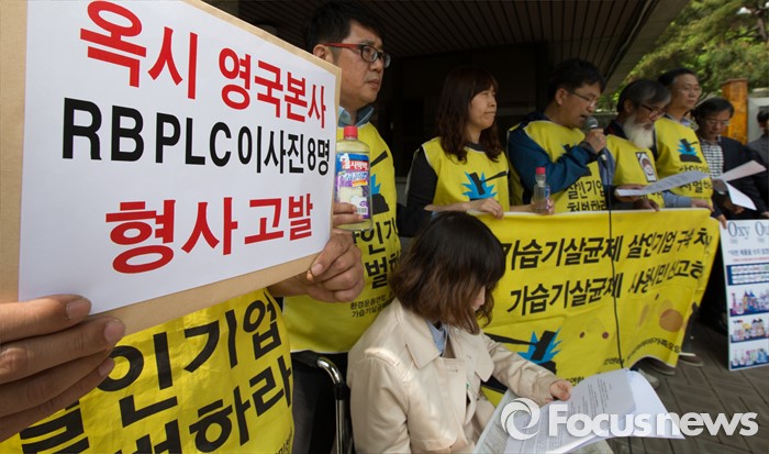 (서울=포커스뉴스) 2일 오후 서울 서초구 서울중앙지방검찰청 앞에서 가습기살균제 피해자와 가족모임과 환경보건시민센터 관계자들이 옥시레킷벤키저 대표 등 8명의 이사진 형사고발 기자회견을 하고 있다.