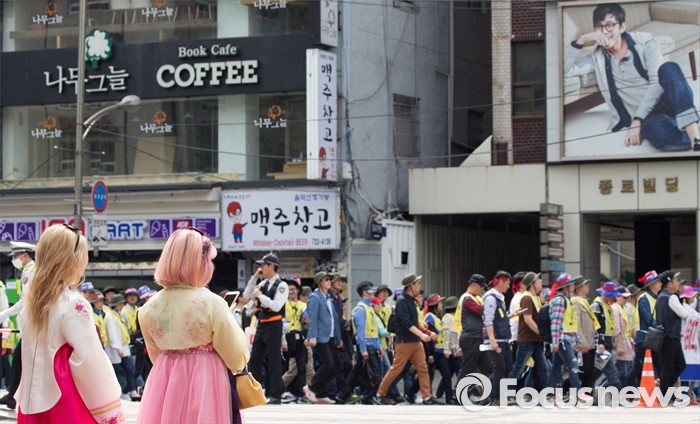 (서울=포커스뉴스) 근로자의날을 맞은 1일 오후 서울광장에서 열린 한국노총 5.1 전국노동자대회를 마친 참가자들이 종로로 행진을 이어가고 있다.