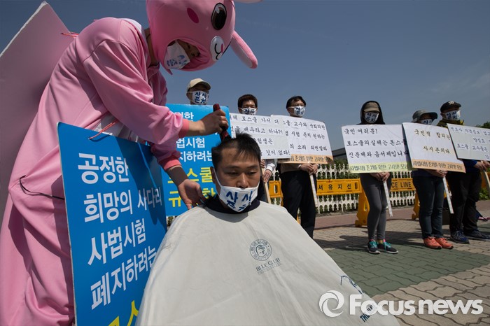 (서울=포커스뉴스) 26일 오전 서울 영등포구 국회의사당 앞에서 사법시험 준비 고시생 이종배씨가 사법시범 존치를 촉구하며 삭발을 하고 있다.