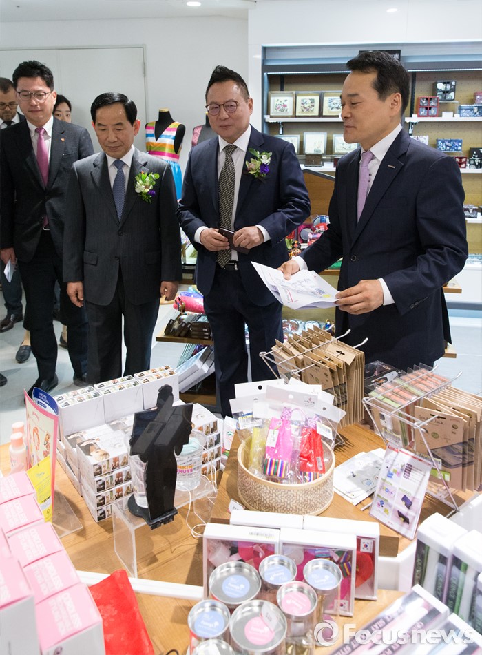 (서울=포커스뉴스) 29일 오전 서울 종로구 SM면세점 서울점에서 열린 그랜드 오픈식에 참석한 권희석 SM면세점 대표이사와 홍용술 중소기업유통센터 대표이사가 매장을 둘러보고 있다.