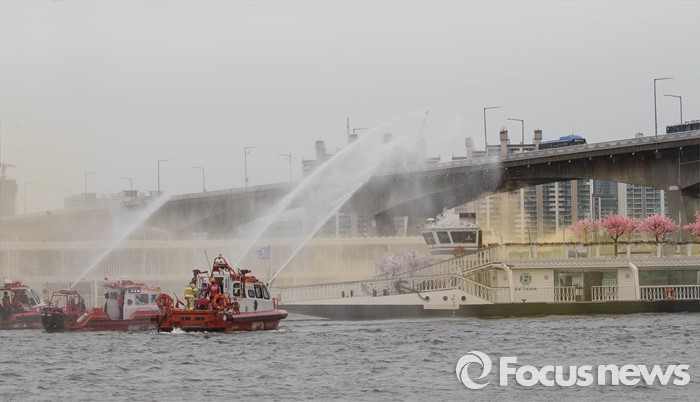 (서울=포커스뉴스) 27일 오전 서울 영등포구 여의도 한강공원 원효대교 일대에서 '수도 서울 민․관․군 합동 대규모 복합재난 가상훈련'이 진행되고 있다.
